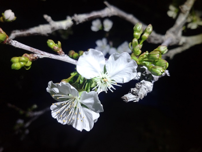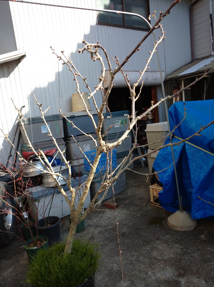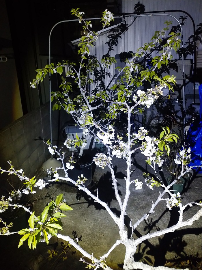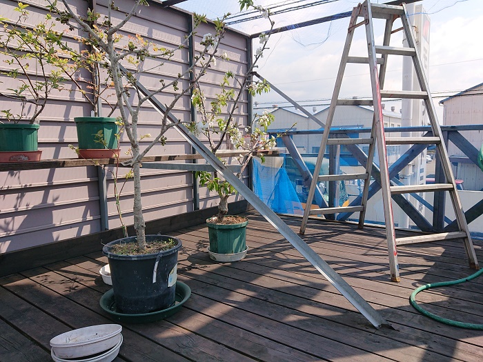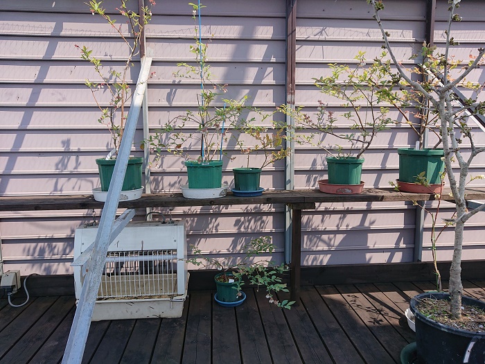 | 4月)コンテナ上果樹園だいぶきれいになってきました。サクランボはほかの木の花粉を付けないと出来ないため、仕事終わりに毎晩授粉しています。木が大きくなり花の数も多くなったので授粉作業は大変な労力です。 |