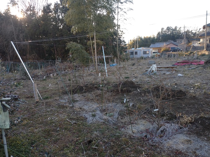 | 2月)ブルーベリーを沢山収穫したいので山の果樹園の作付面積を多くして、しっかりした防鳥ネットを張るため柱やワイヤーなど取り付けました。2~3年後軌道に乗りましたらブルーベリー狩りご招待出来るかもです。 |