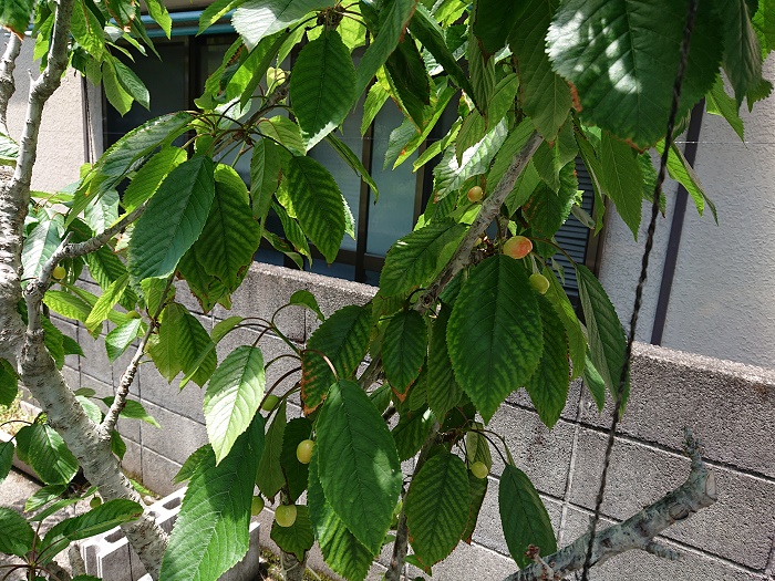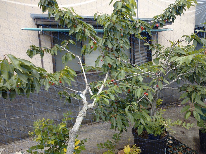 | 5月)サクランボ(高砂)が色づいてきました。早いとこここにも防鳥ネット張らないと。 |