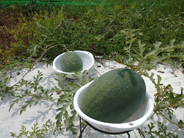 | 6月)天候不順でサクランボの出来は悪かったのですが、ブルーベリー、さくらんぼ、キウイ、桃など実が大きくなるのを見ると嬉しくなってきます。やってみたくてマスクメロンの苗を買ってみました。(メロンと間違えてスイカの苗を1本買ってしまったのは内緒) |