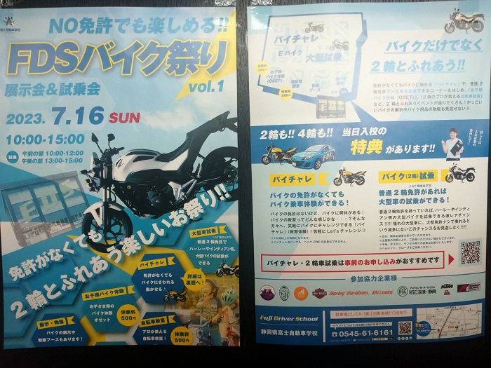 16日 『富士自動車学校バイク祭り』あります。当店も協賛参加で試乗会を開催します。YZF-R7,GIXXER250,vstrom250,cbr250rr,cl250予定