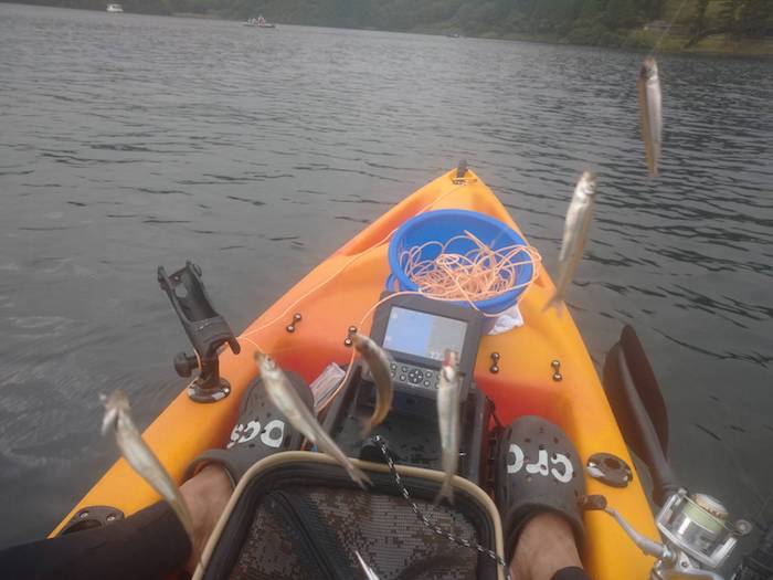 カヤックで芦ノ湖のワカサギ釣りにも挑戦。芦ノ湖は8月からワカサギが釣れます。ひなたは暑いのですが、日陰は涼しい芦ノ湖です。時々、おまけでマスも連れちゃいます。